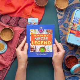 How to Be a Mezze Legend cookbook kit - 4 bespoke Mezze Legend spice blends in stackable tins and a 240 page cookbook with beautiful colour photos of EVERY recipe! Create 80+ dishes from around the Middle East and North Africa. Every recipe can be made using a combination of the 4 special Mezze Legend spice blends included.